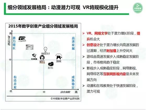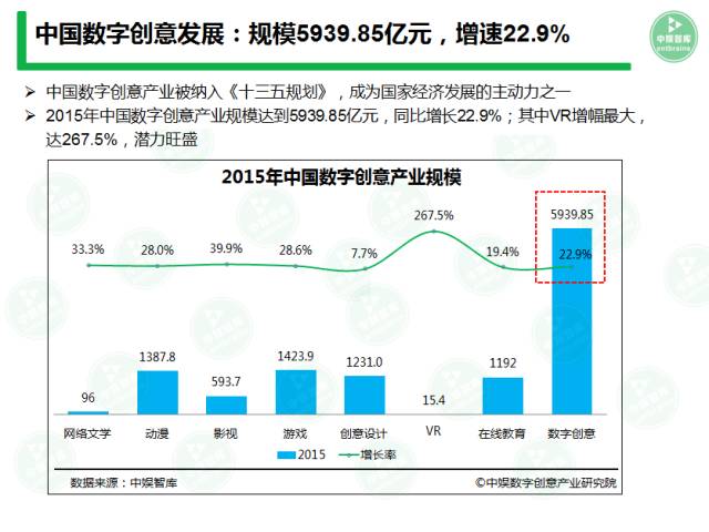 2016年初,“數(shù)字創(chuàng)意產(chǎn)業(yè)”首次出現(xiàn)在政府工作報(bào)告中,并且被納入《十三五規(guī)劃》,成為經(jīng)濟(jì)發(fā)展的主動(dòng)力。2015年我國(guó)數(shù)字創(chuàng)意產(chǎn)業(yè)規(guī)模達(dá)到5939億元,同比增長(zhǎng)22.9%,其中VR增幅最大,達(dá)267.5%。七大細(xì)分領(lǐng)域中,網(wǎng)絡(luò)文學(xué)是IP源頭,增速快;動(dòng)漫的衍生市場(chǎng)潛力大;影視受眾廣泛,爆發(fā)強(qiáng)勁;游戲規(guī)模1424億,電競(jìng)、VR是新增長(zhǎng)點(diǎn);VR規(guī)模15.4億,處于起步階段,潛力旺盛;在線教育結(jié)合語(yǔ)音識(shí)別、AI等技術(shù)將有更多應(yīng)用。