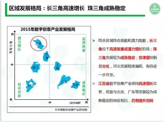區(qū)域綜合指數(shù)顯示:北京居于榜首;上海市需求指數(shù)排名第一,文化娛樂(lè)消費(fèi)意愿較強(qiáng);廣東省企業(yè)指數(shù)居于首位,營(yíng)收能力旺盛;江蘇省要素指數(shù)、企業(yè)指數(shù)均高于平均值,政策和技術(shù)環(huán)境、企業(yè)數(shù)量和營(yíng)收規(guī)??捎^。另外,江蘇省在政策扶持、科研人才和企業(yè)發(fā)展發(fā)面都排名前三,科研支出方最為突出,說(shuō)明江蘇省高度重視創(chuàng)意產(chǎn)業(yè)研發(fā),推動(dòng)行業(yè)發(fā)展。與此同時(shí),區(qū)域發(fā)展呈現(xiàn)差異分布格局:長(zhǎng)三角處于高速增長(zhǎng)階段,珠三角成熟穩(wěn)定,京津冀則稍顯分化,河北發(fā)展程度偏低。江蘇省數(shù)字創(chuàng)意產(chǎn)業(yè)保持高速增長(zhǎng)態(tài)勢(shì),與北京、廣東等發(fā)展較為成熟穩(wěn)定的地區(qū)相比,仍有提升空間。