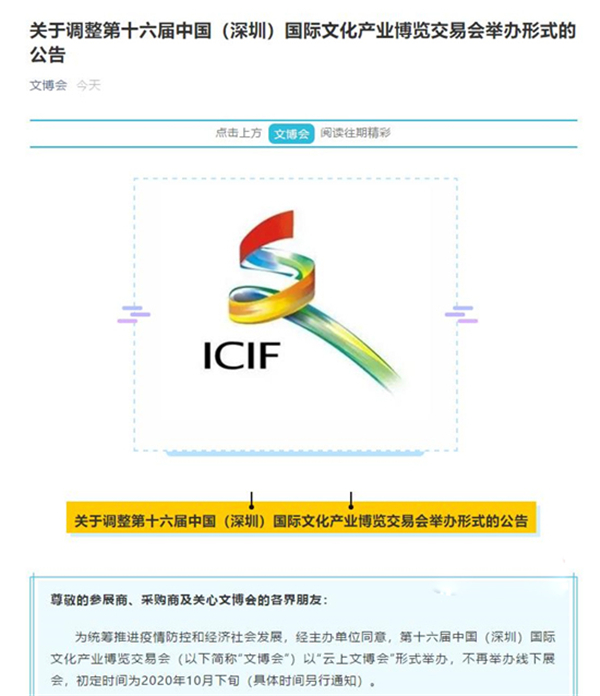 8月11日,文博會官方微信發(fā)布《關(guān)于調(diào)整第十六屆中國(深圳)國際文化產(chǎn)業(yè)博覽交易會舉辦形式的公告》。公告明確,為統(tǒng)籌推進(jìn)疫情防控和經(jīng)濟(jì)社會發(fā)展,經(jīng)主辦單位同意,第十六屆中國(深圳)國際文化產(chǎn)業(yè)博覽交易會(以下簡稱“文博會”)以“云上文博會”形式舉辦,不再舉辦線下展會,初定時間為2020年10月下旬(具體時間另行通知)。