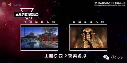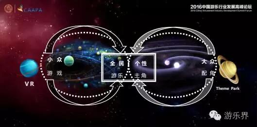 VR俗稱虛擬現(xiàn)實(今天我只講VR,AR不講,MR不講)。VR最早的發(fā)展應(yīng)該是運用在軍事科技上的。實際上樂園很多游樂設(shè)備都是從國防工業(yè)發(fā)展過來的,包括我們看到的動感電影,VR也是這樣的。當VR技術(shù)發(fā)展起來后,大家發(fā)現(xiàn)這個東西挺好的,拿來用也不錯,所以慢慢地,從個人的游戲發(fā)展成為大眾的游戲,從一個人玩變成很多人玩。為什么很多人玩呢?因為很多人玩,市場才能做大。另外我們再回頭看一下主題樂園的發(fā)展模式,從游樂園到主題樂園,到IP的主題樂園。其實主題樂園跟IP主題樂園差別不是很大。但是我們看到一個趨勢,就是真實的主題樂園發(fā)展到虛擬的主題樂園。而且真實跟虛擬之間有個界限,真實的越來越虛擬,虛擬的越來越真實。在這里面我們看到一個共識:主題樂園越來越講究個人化的發(fā)展。
