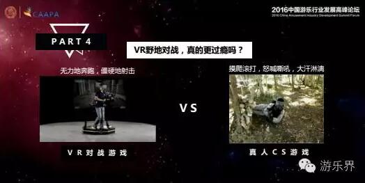 VR的對戰(zhàn)游戲,跟你跑到森林里面打真人CS,槍打到身上會痛,一樣嗎?不一樣。