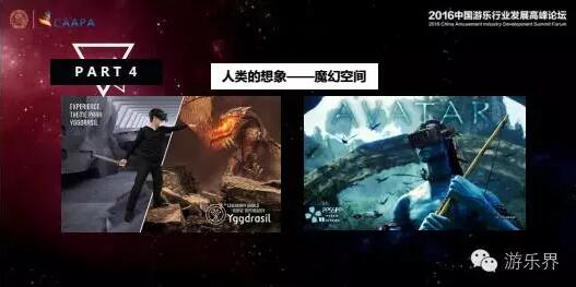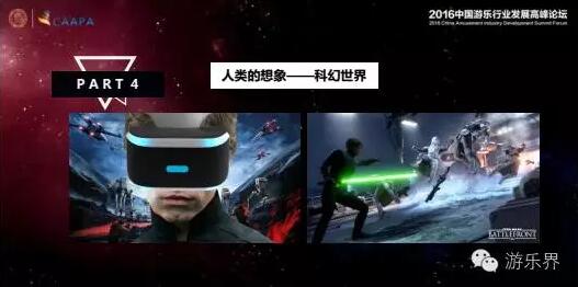 所以我們可以看到魔幻空間是VR適合表現(xiàn)的,因為你很難找到替代的。所以在這里VR找到機會。科幻的世界,你要去星際大戰(zhàn),沒有機會的。但是我們把頭盔戴上,你就可以星際大戰(zhàn)。