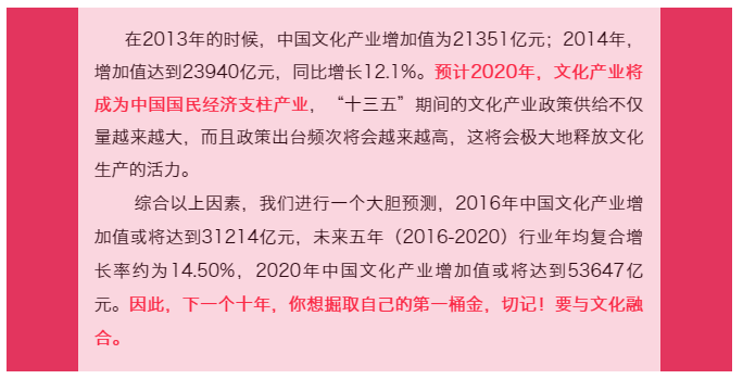 從上述多個轉(zhuǎn)型的成功案例可以看出,未來,中國轉(zhuǎn)型發(fā)展,一樣需要文化產(chǎn)業(yè)為龍頭,進(jìn)行產(chǎn)業(yè)升級發(fā)展。文化與任何行業(yè)都息息相關(guān),文化其可發(fā)揮和想象空間也是巨大的,文化所創(chuàng)造了產(chǎn)能和價值是任何一個傳統(tǒng)產(chǎn)業(yè)無法比擬的。