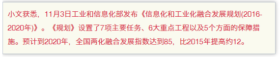 為貫徹落實《中華人民共和國國民經(jīng)濟和社會發(fā)展第十三個五年規(guī)劃綱要》和《中國制造2025》,加快建設(shè)制造強國,推動信息化和工業(yè)化深度融合,工業(yè)和信息化部編制了《信息化和工業(yè)化融合發(fā)展規(guī)劃(2016-2020)》?,F(xiàn)印發(fā)你們,請結(jié)合實際認(rèn)真貫徹實施。
