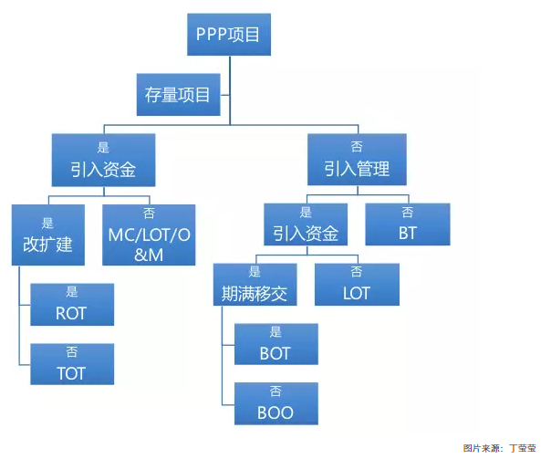 而一個(gè)PPP項(xiàng)目選擇合作模式可以根據(jù)是否有存量項(xiàng)目、是否改擴(kuò)建、是否移交等方面問題選擇具體的合作模式: