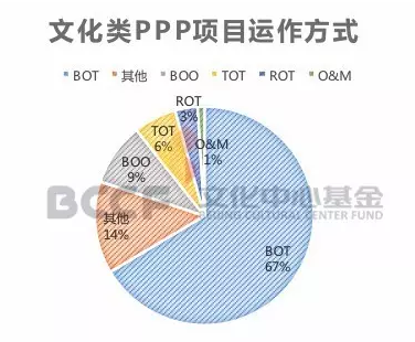運(yùn)作方式根據(jù)財(cái)政部政府與社會(huì)資本合作中心公布的資料(截至9月30日),在共計(jì)301項(xiàng)文化類PPP項(xiàng)目中,BOT項(xiàng)目運(yùn)作方式是主流,BOO、TOT等方式也在實(shí)踐。具體而言,采用BOT方式的有200個(gè),占比67%;采用BOO方式的有28個(gè),占比9%;采用TOT方式的有19個(gè),占比6%;采用ROT方式的有10個(gè),占比3%;采用O&M方式的有3個(gè),占比1%;采用其他方式的有41個(gè),占比14%。