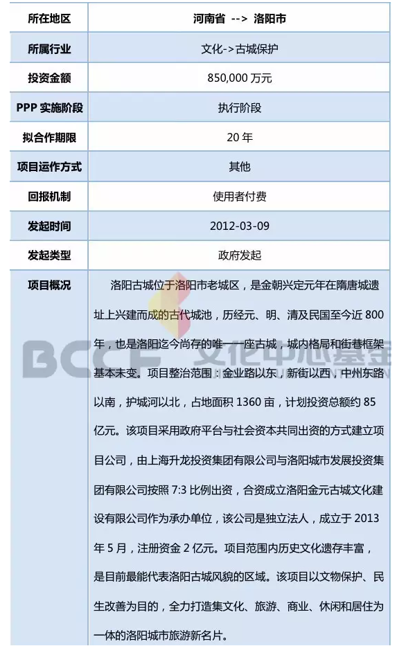 在文化類PPP項(xiàng)目的其他運(yùn)作方式中,還有河南省洛陽古城保護(hù)與整治PPP項(xiàng)目。該項(xiàng)目共獲85億元的總投資,由洛陽市政府與上海升龍投資集團(tuán)有限公司合作。該項(xiàng)目也是洛陽最大的棚戶區(qū)改造項(xiàng)目,建成后將成為以明清建筑風(fēng)格為基調(diào),集文化展示、文化創(chuàng)意、文化商業(yè)于一體的文化示范區(qū)。
