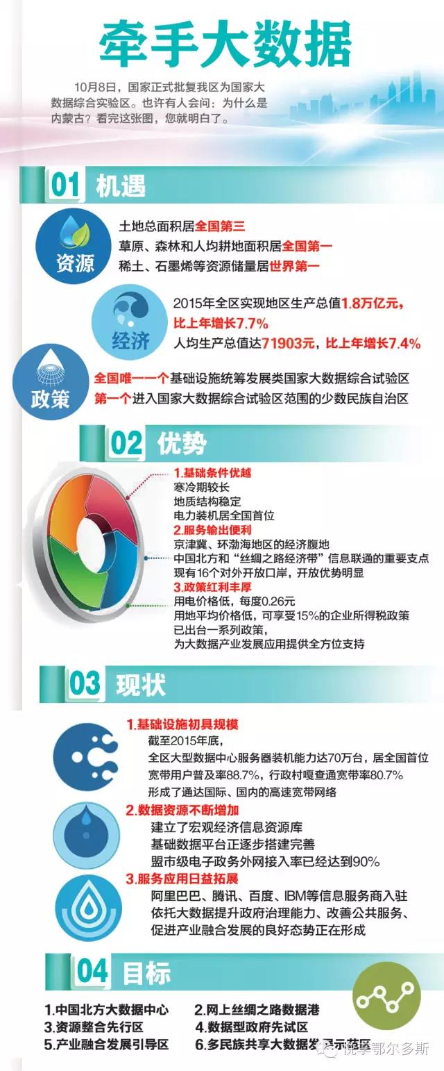 鄂爾多斯市發(fā)展大數(shù)據(jù)產(chǎn)業(yè)有著獨特的區(qū)位、氣候、地質(zhì)、電力、政策優(yōu)勢和條件。鄂爾多斯市于2009年就開始發(fā)展云計算產(chǎn)業(yè), 2010年被內(nèi)蒙古自治區(qū)政府確定為全區(qū)云計算產(chǎn)業(yè)發(fā)展重點地區(qū)。2013年順應形勢,積極延伸產(chǎn)業(yè)鏈,打造云計算大數(shù)據(jù)基地。近日,國家發(fā)改委、工信部、網(wǎng)信辦聯(lián)合批復內(nèi)蒙古為全國唯一一個大數(shù)據(jù)發(fā)展綜合試驗區(qū)。鄂爾多斯作為呼包鄂協(xié)同發(fā)展的重要一級,發(fā)展大數(shù)據(jù)產(chǎn)業(yè)潛力巨大、優(yōu)勢明顯、前景看好。