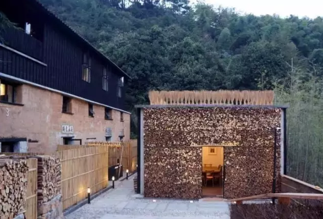 民宿云夕?戴家山設(shè)計取材于山林,設(shè)屋頂有掃帚墻,300把掃帚由莪山當(dāng)?shù)剞r(nóng)戶用自己種的掃帚草綁扎而成,用原始的木頭壘起來的外墻裝飾呈現(xiàn)了鄉(xiāng)土建筑最本真的設(shè)計格調(diào),貼近自然,返璞而生態(tài)。