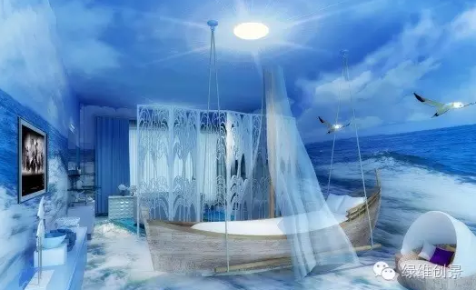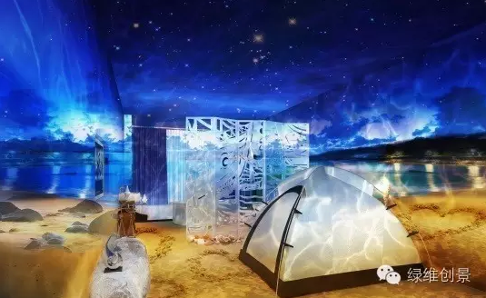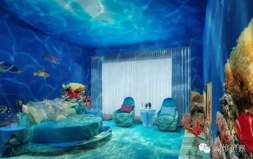 綠維浙江分院設(shè)計桃逸時,大膽地將3D全息投影技術(shù)同民宿進行無縫對接,借助3D全息投影技術(shù)模擬海上、海底和海灘的場景,投影本身內(nèi)置了真實的音效功能,可以從視覺、聽覺方面帶給客人不一樣的居住體驗。