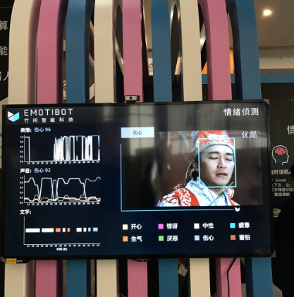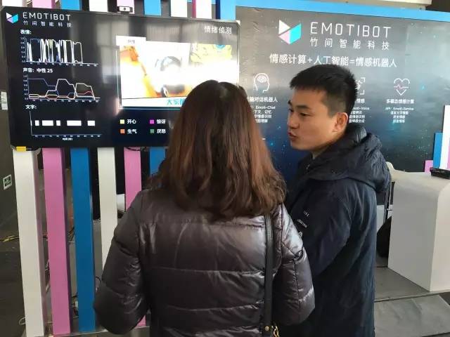 竹間科技的主打產品是 Emotibot,它致力于打造高智商和情商兼?zhèn)涞膫€人智能伴侶?,F場展區(qū)的主要位置被兩個自帶攝像頭的五十寸大屏占據。