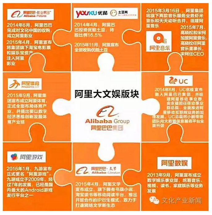今年6月15日,阿里巴巴官微發(fā)布消息稱,阿里集團(tuán)CEO張勇宣布正式成立“阿里巴巴大文娛版塊”,旗下囊括阿里影業(yè)、合一集團(tuán)(優(yōu)酷土豆)、阿里音樂、阿里體育、UC、阿里游戲、阿里文學(xué)、數(shù)字娛樂事業(yè)部等。至此。阿里集團(tuán)的文化產(chǎn)業(yè)布局從投資、制作、發(fā)行、渠道到終端,有了完整的大構(gòu)架。
