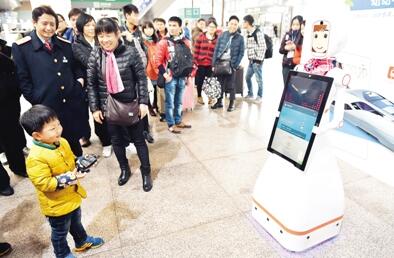 2月1日,一臺(tái)名叫“小璐”的智能機(jī)器人亮相廣州南站,吸引了大批旅客的圍觀,大家紛紛嘗試與“小璐”對話,向她咨詢列車時(shí)刻、購票信息、天氣情況等問題,“小璐”不僅可以用甜美的女聲一一作答,還可以在接收到語音指令后,為旅客“唱歌”和“跳舞”。據(jù)了解,使用智能機(jī)器人服務(wù)旅客是廣州南站在今年春運(yùn)中的新嘗試,如果試用效果良好,今后有望在車站中看到更多智能機(jī)器人的身影。圖為一位小朋友嘗試與智能機(jī)器人“小璐”對話。