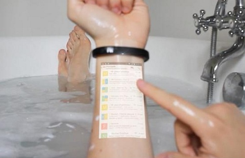 cicret安裝有Android系統(tǒng)和相關(guān)應(yīng)用,內(nèi)置了八個長距離傳感器和微型投影器,戴在手腕上迅速轉(zhuǎn)動一下就會投影出安卓操作界面,進行瀏覽圖片、接聽電話、收發(fā)郵件、觀看視頻等常用操作。硬件方面,cicret內(nèi)置了GPS模塊、振動電機、無線藍牙和wifi模塊,當然傳感器、微型投影器、處理器和內(nèi)存是少不了的,還可以不與手機連接單獨使用。防水設(shè)計即使你一邊浸浴一邊玩也不用擔心損壞。