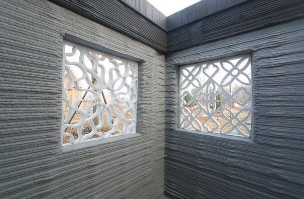 建房的材料是水泥混凝土,與普通人造房屋不同,3D打印出來的墻體是凹凸不平的波浪形。造房的整個(gè)過程都是由電腦程序控制完成。按照設(shè)計(jì)圖,用3D打印機(jī)噴嘴噴出高密度、高性能混凝土,逐層打印出墻壁和隔間、裝飾等。再用機(jī)械手臂完成整座房子的基本架構(gòu)。